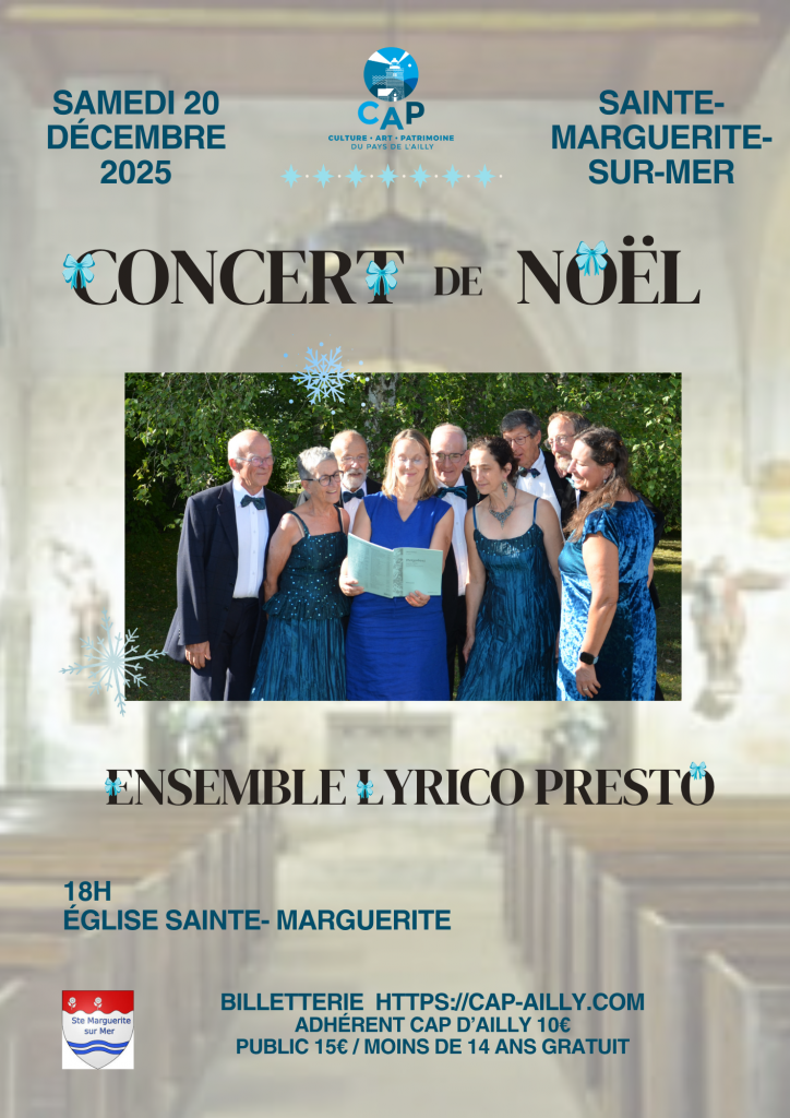 Nos bénévoles vous attendent le samedi 20 décembre 2025 à 18h à l’église de Sainte-Marguerite-sur-Mer pour le traditionnel Concert de Noël avec l’ensemble Lyrico Presto !